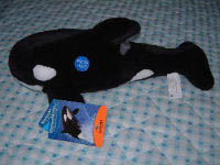 (昨夜12時過ぎに家についたらしい・・・) 廊下にでっかいトランクが鎮座。 2週間分位の荷物が入る、特大サイズをレンタルしたので 相当大きなケースな訳で・・・。 ナビ、昨日は遅かったので兄ちゃんと対面しなかったみたいですが 今朝はトランクを「クンクンクン」 台所へ入った父に目もくれず、暫く匂いを嗅ぎ回っていたらしい。 1週間もどこに出かけていたのか、気になったのかな(^m^) 少し前から、ナビに新ワザを教えています。 「ちょーだい☆」をさせたくて。トイプーちゃんが、ご褒美欲しさに 両手をあげて手招きしているのを見て、可愛くって!! でもナビに「手招き」は出来なかったので お座り→両手をあげる(昔風に言う、ちんちんのポーズ?) で「ちょうだい」と教えた。今まで「ナビ、ちょうだい」と言うと ナビのために取って置いたフードや果物を横取りする時に 「貰っても良い?=ちょうだい」と使っていたので 最初は、その意味の違いを教えるのが大変でしたが 「チョウダイは?」と言うと、何となく出来るように・・・。 最近はゴハンを食べる前に お座り、伏せ、お手、おかわり、 握手(片手・両手) ワン!、アゴ、ちょうだい、待て ・・・と9種類も?! をランダムに出して挑戦している。 9種類かぁ・・・ナビも大変だね(苦笑) ![]() ※写真は、Aki君がお土産に買って来てくれたシャチ?のぬいぐるみ。 沢山の縫いぐるみを買って来ていて、 彼女のものよりも先に選ばせてくれたんだけど(爆) 私よりも先に、ナビが選んだのでした(ワハハ) 横の青いシールを押すと、3種類くらいの英語を喋るのですが 最初ビビっていたナビも慣れると面白くなったらしい・・・ ひたすらこの縫いぐるみを触ろうとしていたので、コレにしたのでした。 2002/12/18 水 22:26 /