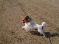 ![]() お天気も良かったので、ナビを連れて小鳥の森へ。 6日に行ったばかりなんだけど、今週末はシャンプーの予定だし、 新しく100均で買ったボールの威力も試して見たかったので (外でナビが目新しいボールに興味を持つかどうか) いそいそとお出かけ♪ 10時過ぎから30分くらい遊んだのですが、 パーカー1枚で上着が要らないくらいに暖かかったです。 ナビもグラウンドへ降ろすなり、一人でテクテク歩いていく。 ボールを出してみると、目がキラリン☆ 遠くへ投げてやると、9mのリードを目一杯伸ばしても 届かないようなところまで飛んでしまって(^^;) リードをピンと張って必死に追いかけていました。 ちゃんとボールをキャッチしたら、持ってくるんですよぉ (渡してくれないけれど・・・) 家で遊んでいる時は「とれるもんなら取りに来てごらん!」と 小憎たらしい態度なのに(爆) ジャンプキャッチもしていました。さすがだ。 ボールを受け取るのに追いかけっこをしたり、 私が走りまわらなくてもボールを投げることで、 ナビが適度に運動してくれたり (病み上がりなので、ちょっと走ってもヘトヘトだった・・・運動不足?) ボール効果は上々でした。やったね(^^)v その後、チョコ持ってニックスワンへ。 おもちちゃんとオコメちゃんに負けていたナビ・・・。 今日は最初から長居する予定ではなかったので、 マーキング防止パンツも持っていなかったし少しだけで帰りました。 いつもお世話になっているのに、こういう機会が無いと なかなかお礼って出来ないからね。 帰りに本屋へ寄って、ドッグファミリー(2冊目)と ドッグファンをゲット♪ ゆーこさん&ぱぴちゃん発見! 2003/02/15 土 22:11 /